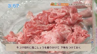 牛細切れに塩こしょうを振りかけて下味をつけておきます。