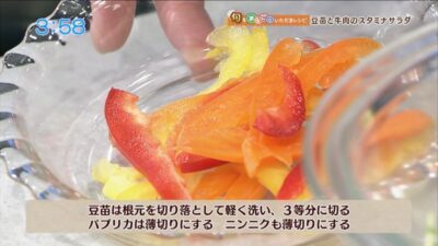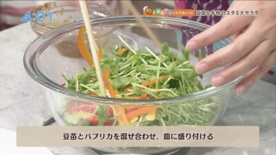 豆苗とパプリカを混ぜ合わせ、皿に盛り付けます。