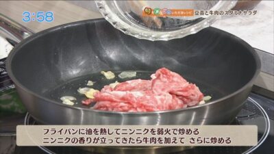 フライパンに油を熱してニンニクを弱火で炒めます。ニンニクの香りが立ってきたら牛肉を加えてさらに炒めます。