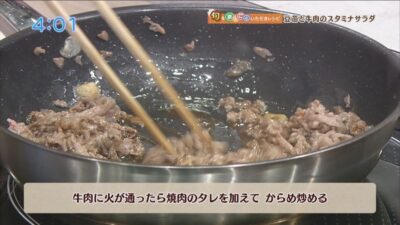 牛肉に火が通ったら焼肉のたれを加えて からめ炒めます。