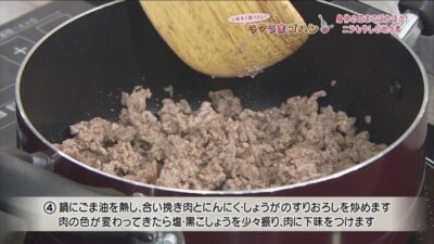 鍋にごま油を熱し、合い挽き肉とにんにく・しょうがのすりおろしを炒めます。肉の色が変わってきたら塩・黒こしょうを少々振り、肉に下味をつけます。
