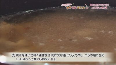 煮汁を注いで軽く沸騰させ、肉に火が通ったら、もやし、ニラの順に加え、1~2分さっと煮たら弱火にします。