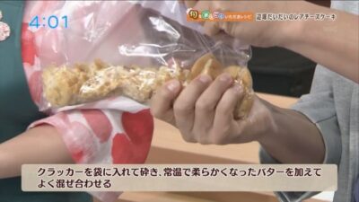 クラッカーを袋に入れて砕き、常温で柔らかくなったバターを加えてよく混ぜ合わせます。