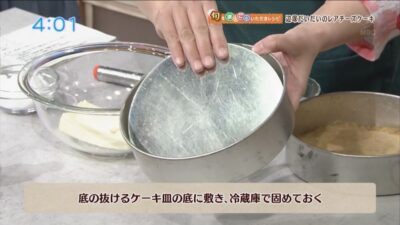 底の抜けるケーキ皿の底に敷き、冷蔵庫で固めておきます。