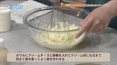 ボウルにクリームチーズと砂糖を入れてクリーム状になるまで泡立て器を使ってよく混ぜ合わせます。