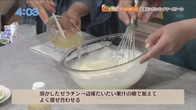 溶かしたゼラチン→辺塚だいだい果汁の順でを加えてよく混ぜあわせます。
