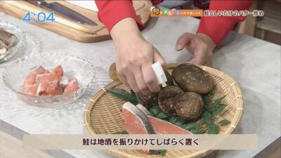 鮭は地酒を振りかけてしばらく置きます。
