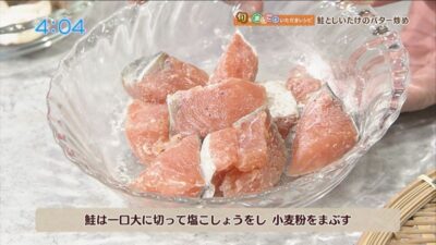 鮭は一口大に切って塩こしょうをし、小麦粉をまぶします。