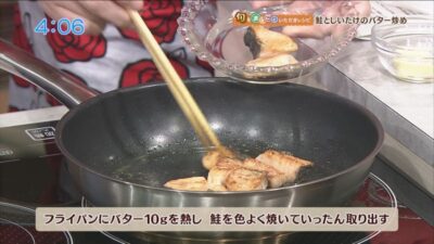 フライパンにバター10gを熱し、鮭を色よく焼いていったん取り出します。