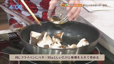 同じフライパンにバター10gとしいたけと地酒を入れて炒めます。