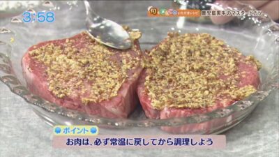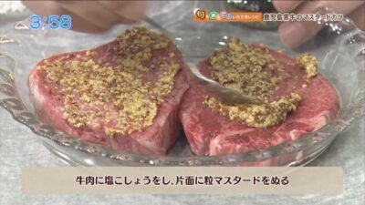 牛肉を塩コショウをし、片面に粒マスタードをぬる。