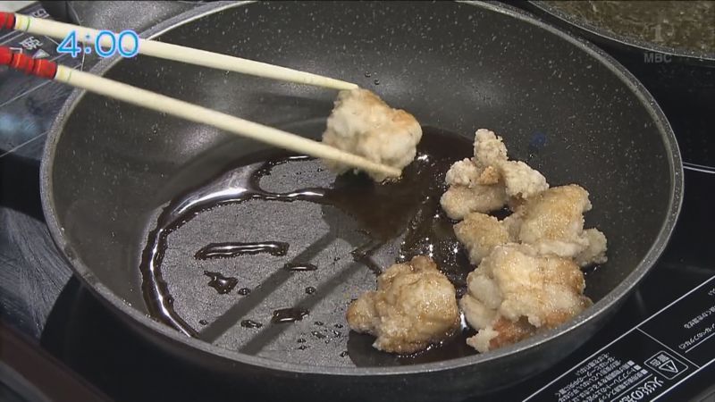 フライパンにたれの調味料を入れて、さっと沸騰させ火を消したら、唐揚げを入れてからめる。
