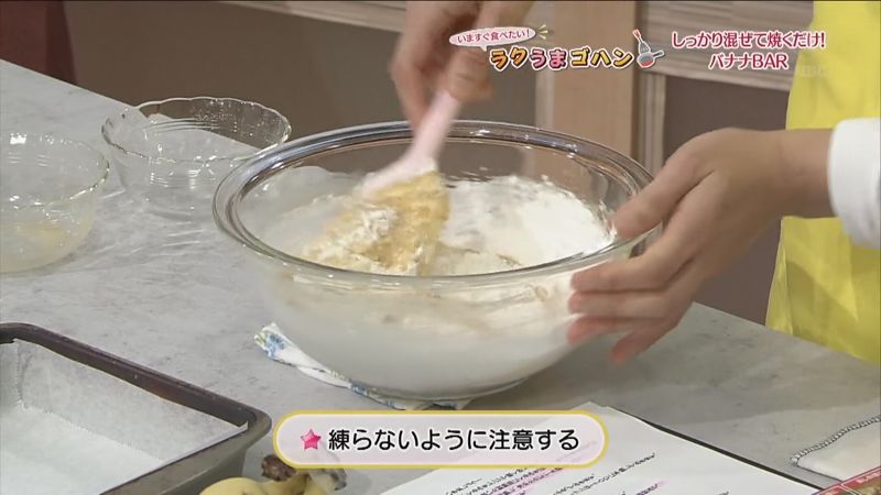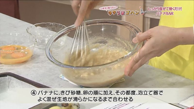 バナナに、きび砂糖、卵の順に加え、その都度、泡立て器でよく混ぜ生地が滑らかになるまで合わせます。
