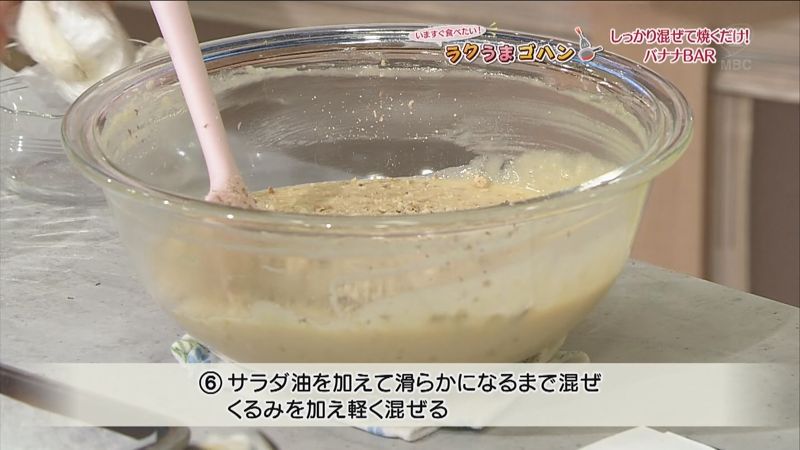 サラダ油を加えて滑らかになるまで混ぜ、くるみを加え軽く混ぜます。