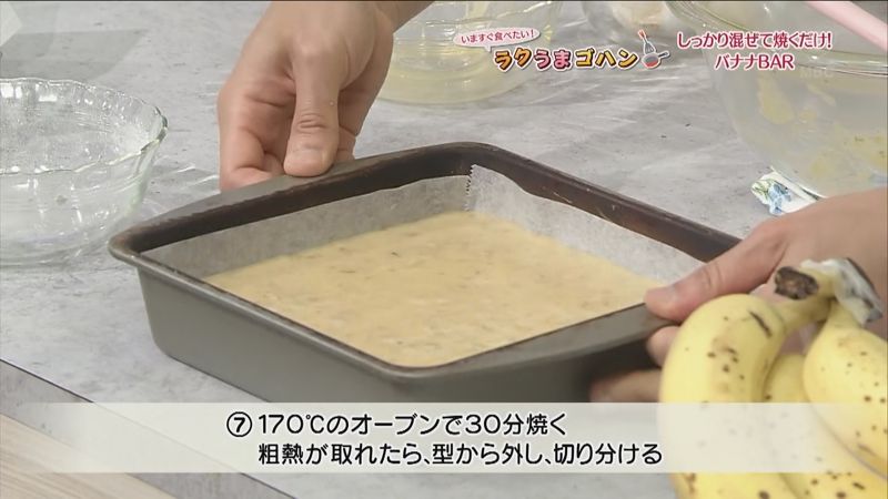 170℃のオーブンで30分焼きます。粗熱が取れたら、型から外し、切り分けます。