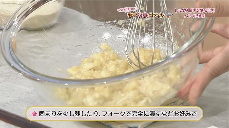 ボウルにバナナを正味220g計量します。泡立て器で固まりを潰し、好みの大きさに潰します。