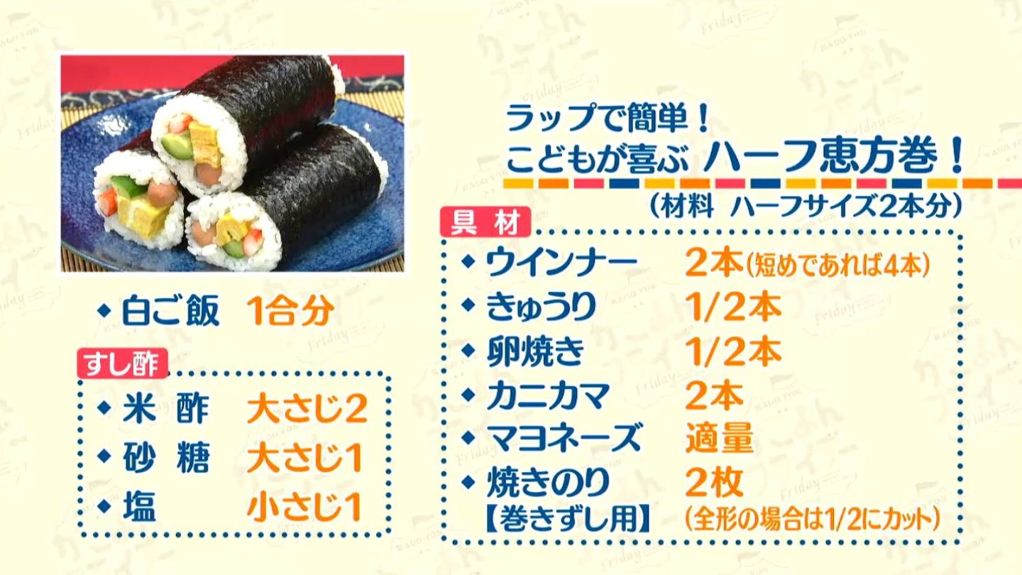 ハーフサイズのため作りやすく、大人も子供も食べやすい家族みんなが笑顔になる恵方巻です!