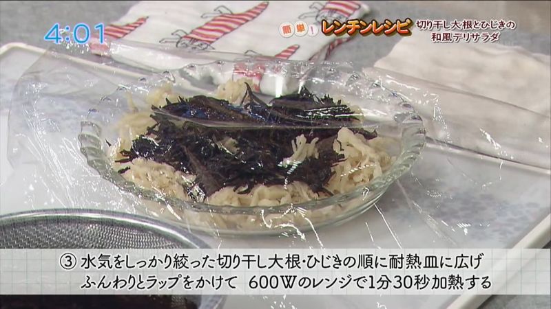 - 切り干し大根をレンジ加熱することで、歯ごたえ良く仕上がります。