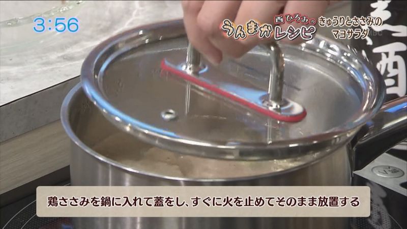 鶏ささみを鍋に入れて蓋をし、すぐに火を止めてそのまま放置します
