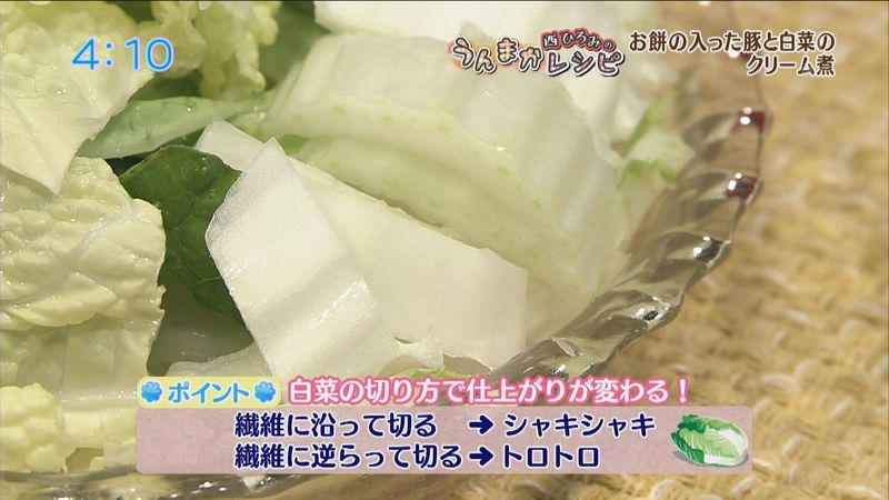 白菜の切り方で仕上がりが変わります。繊維に沿って切るとシャキシャキに、繊維に逆らって切るとトロトロに仕上がります