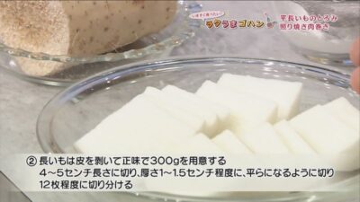長いもは皮を剥いて正味で300gを用意します。4~5cm長さに切り、厚さ 1~1.5cm程度に、平になるように切り、12枚程度に切り分けましょう。