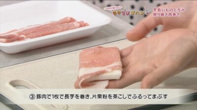 豚肉 1枚で長芋を巻き、片栗粉を茶こしでふるってまぶしましょう。