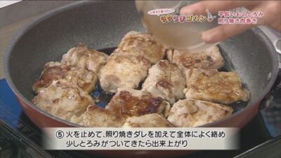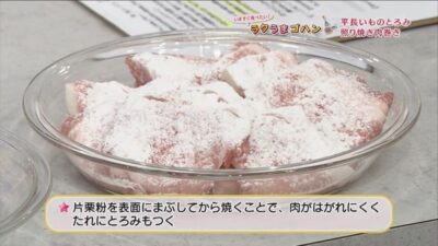 ★片栗粉を表面にまぶしてから焼くことで、肉がはがれにくく、タレにとろみもつきます。