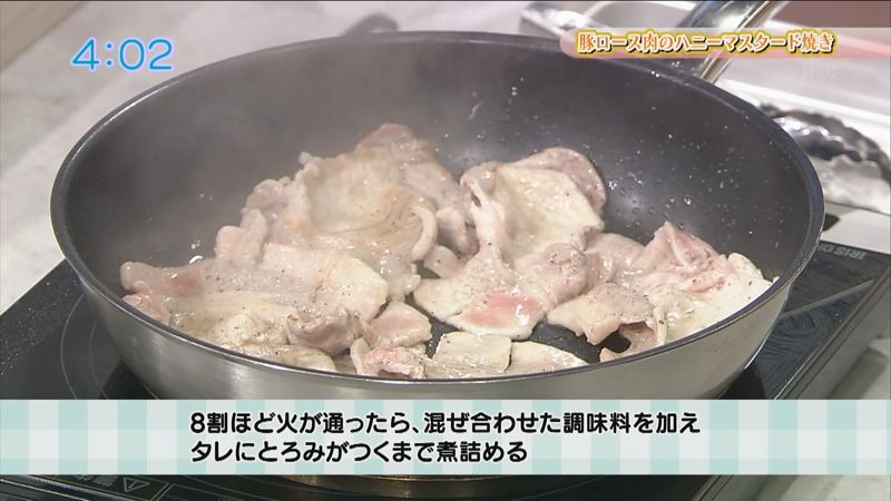 8割ほど火が通ったら、混ぜ合わせた調味料を加え、タレにとろみがつくまで煮詰めます。