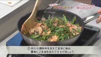 しらたきをフライパンの端に寄せて豚肉を炒めます。白菜キムチ、ニラ、を加えて更に強火で水分を飛ばす様に炒めます。