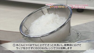 糸こんにゃくはザルに上げてさっと水洗いし、耐熱皿に広げてラップをかけずに600Wのレンジで3分加熱します。