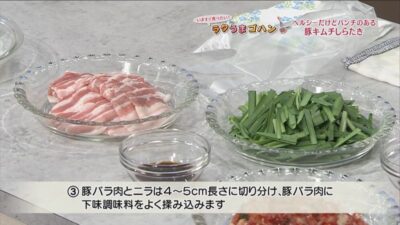豚バラ肉とニラは4~5cm長さに切り分け、豚バラ肉に下味調味料をよく揉み込みます。