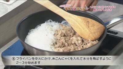 フライパンを中火にかけ、糸こんにゃくを入れて水分を飛ばすように2~3分炒めます。