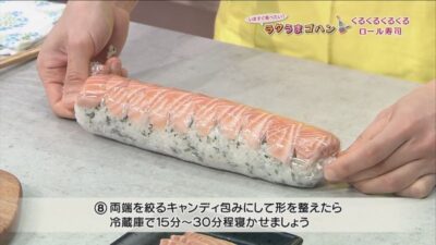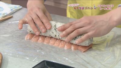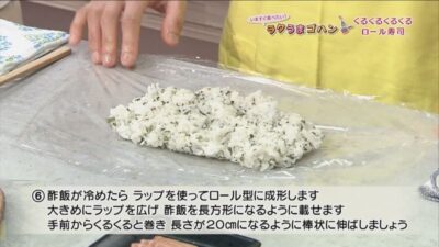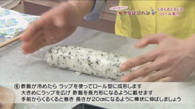 酢飯が冷めたら、ラップを使ってロール型に成形します。大きめにラップを広げ、酢飯を長方形になるように載せます。手前からくるくると巻き、長さが20cmになるように棒状に伸ばしましょう。