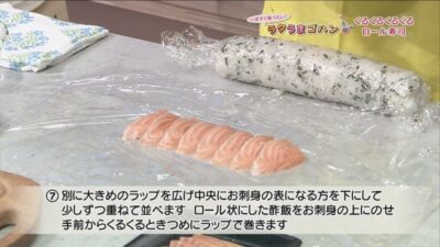 ラップでくるくると巻くだけ!華やかなロール寿司です。