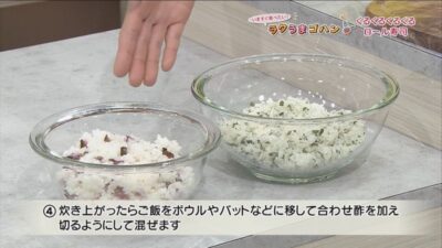 炊き上がったら、ご飯をボウルやバットなどに移して合わせ酢を加え、切るようにして混ぜます。酢飯を2等分にし、青じそ・しば漬けをそれぞれ混ぜ込んで冷ましましょう。