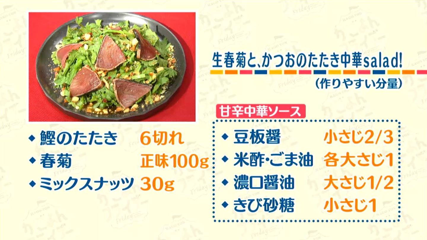 鰹のたたきの旨味と、生で柔らかく食べ易い春菊のコラボレーション! とっても相性のいい、ごま油香る甘辛中華ソースで、カルパッチョ風のササっとサラダにしちゃいます。