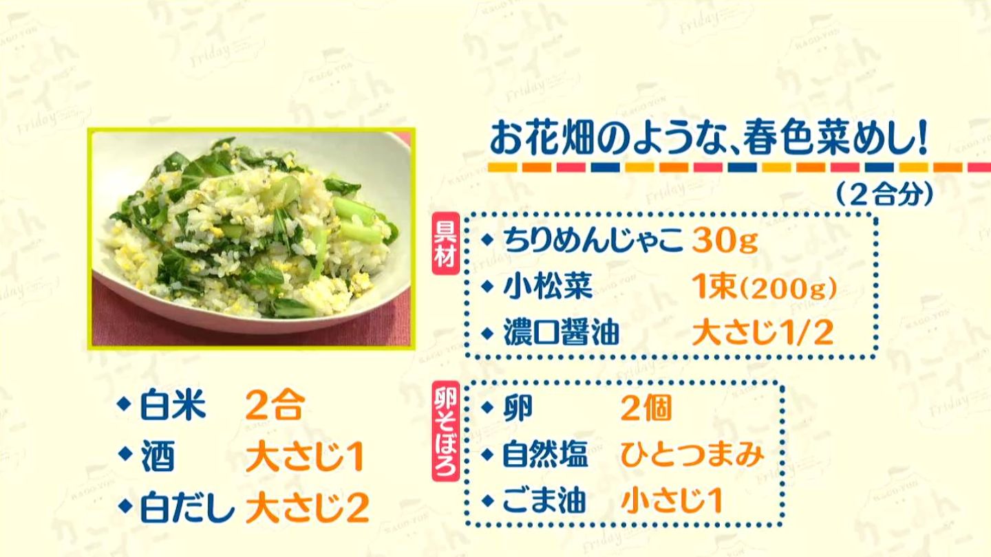 生で加える小松菜のシャキシャキ食感がおいしい春色の混ぜご飯です。 レンジで簡単に作る、ミモザのお花のような、卵そぼろもご紹介します!