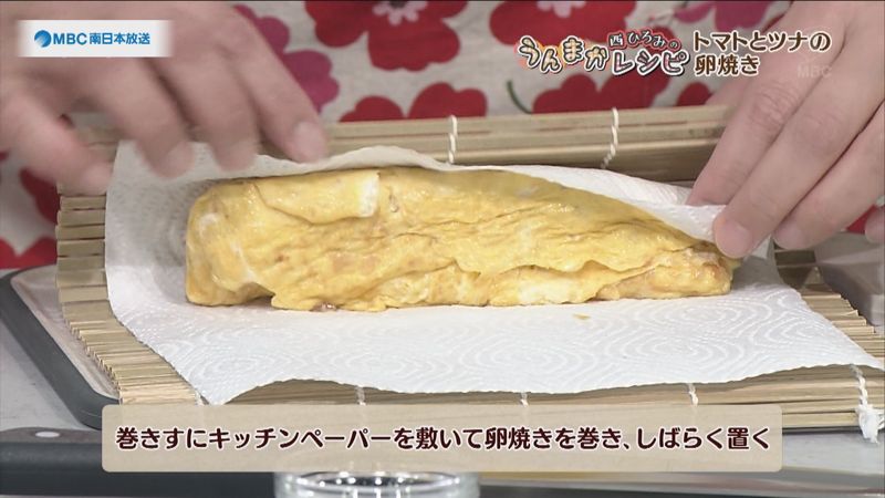 巻きすにキッチンペーパーを敷いて卵焼きを巻き、しばらく置きます。