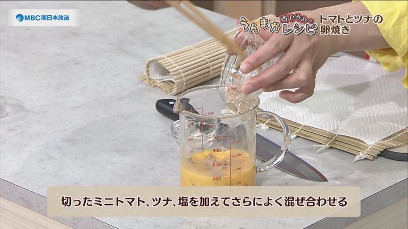 切ったミニトマト、ツナ、塩を加えてさらによく混ぜ合わせます。