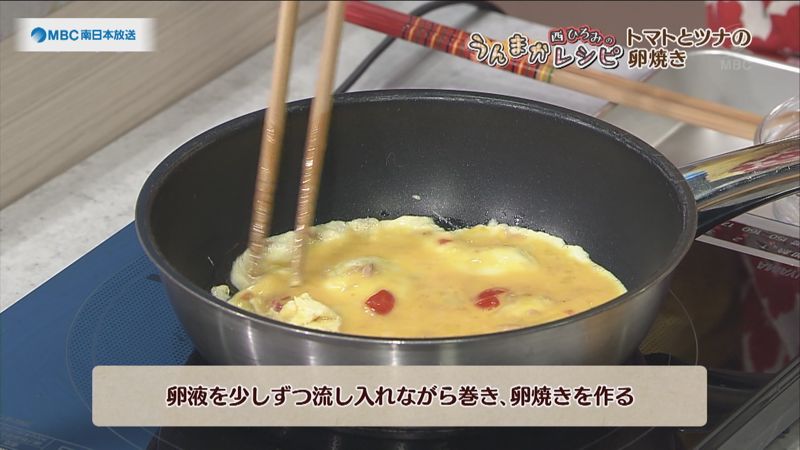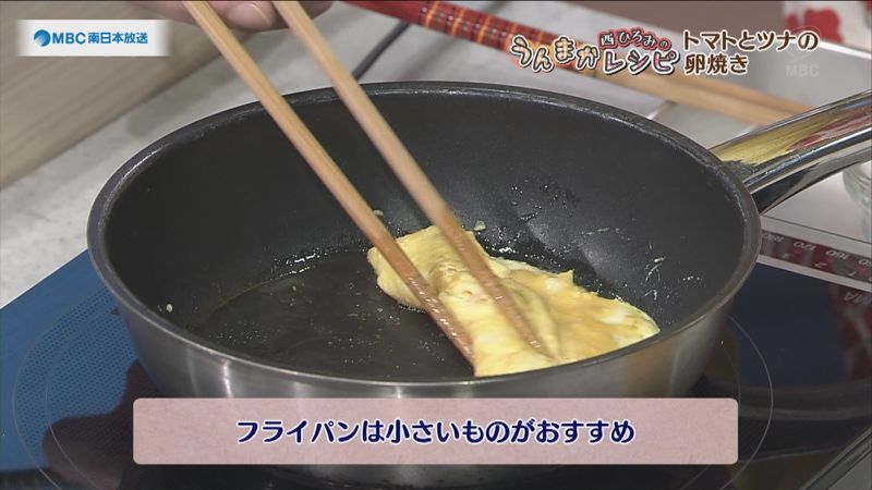 卵液を少しずつ流し入れながら巻き、卵焼きを作ります。※フライパンは小さいものがおすすめです。
