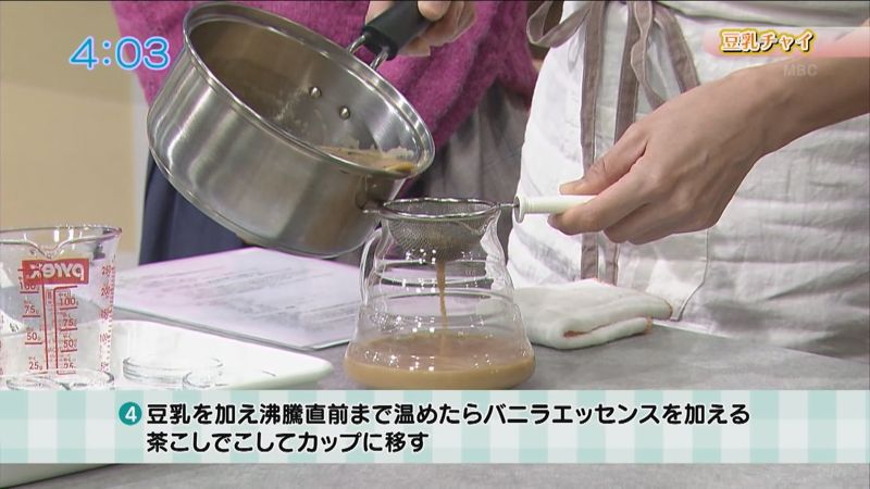 豆乳を加え、沸騰直前まで温めたら、バニラエッセンスを加える。
