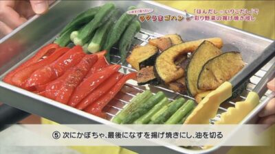 次にかぼちゃ、最後になすを揚げ焼きにし、油を切りましょう。