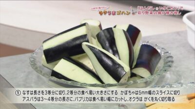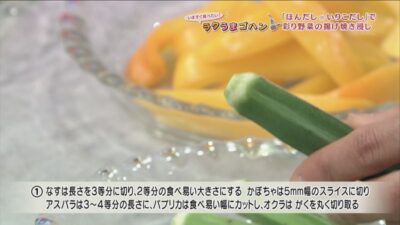 なすは長さを3等分に切り、2等分の食べ易い大きさにします。かぼちゃは5mm幅のスライスに切り、アスパラは3~4等分の長さに、パプリカは食べ易い幅にカットし、オクラはがくを丸く切り取りましょう。