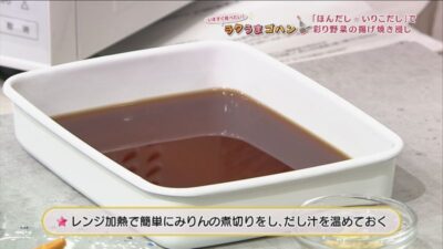 *レンジ加熱で簡単にみりんの煮切りをし、だし汁を温めておきます。- 4