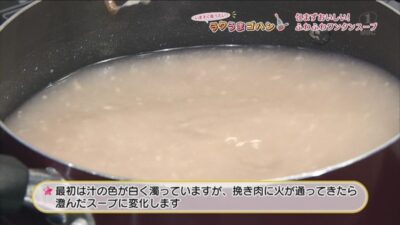 ※最初は汁の色が白く濁っていますが、挽き肉に火が通ってきたら、澄んだスープに変化します。