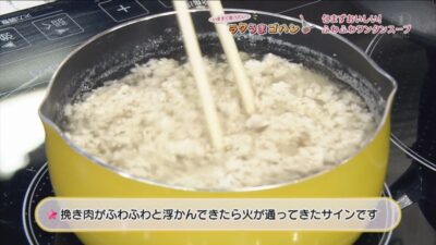 - たんぱく質は60℃位から固まり始めるので、挽き肉を水から加熱することで、ゆっくりと火が通り、ふわふわな食感のスープに仕上がります。
